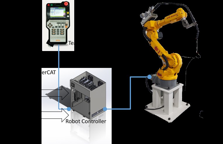 수직다관절로봇은 로봇 매니퓰레이터(Manipulator), 제어기(Controller), 조작기(Teaching Pendant)로 구성되어 있으며, 매니퓰레이터의 각 부의 링크와 AC서보모터, 감속기로 구성되어 있다. 제어기는 서보드라이버와 함께 모션제어기능을 하는 모션보드, 데이터를 통합하는 메인보드, IO관리를 하는 IO보드와 이를 서로 Multi-Process할 수 있게 하는 마더보드로 구성되어 있다. 마지막으로 사용자 조작기는 사용자가 사용하기 편리하게 해주는 UI를 구성하고 있다.